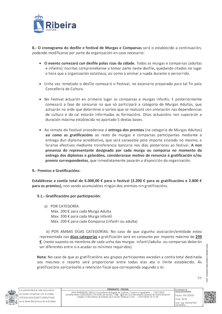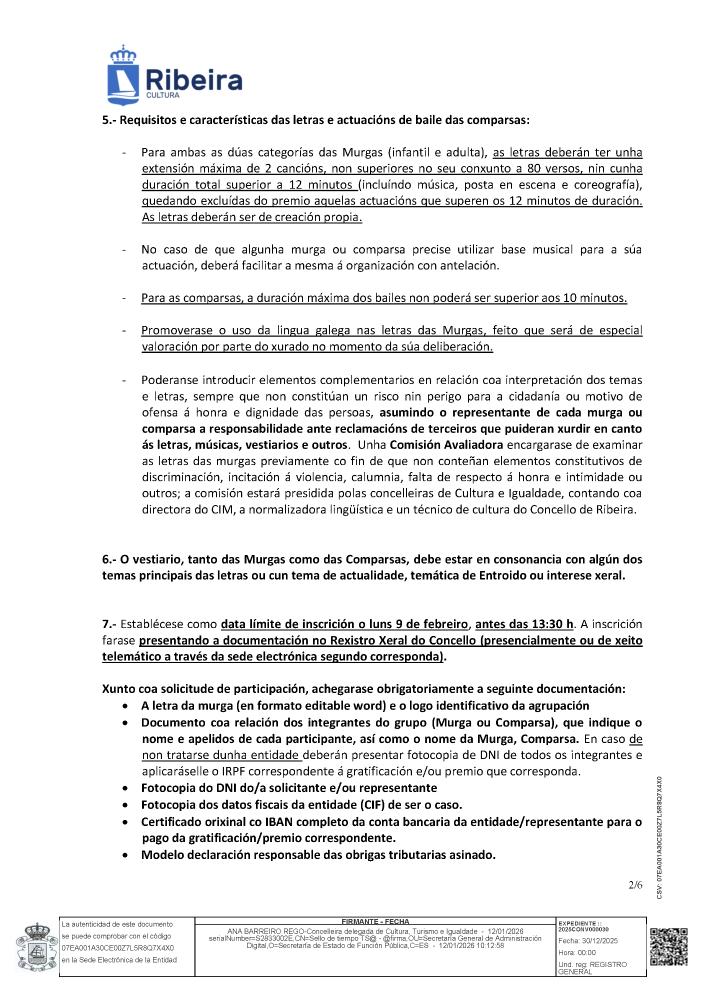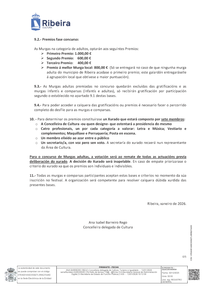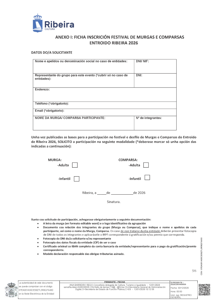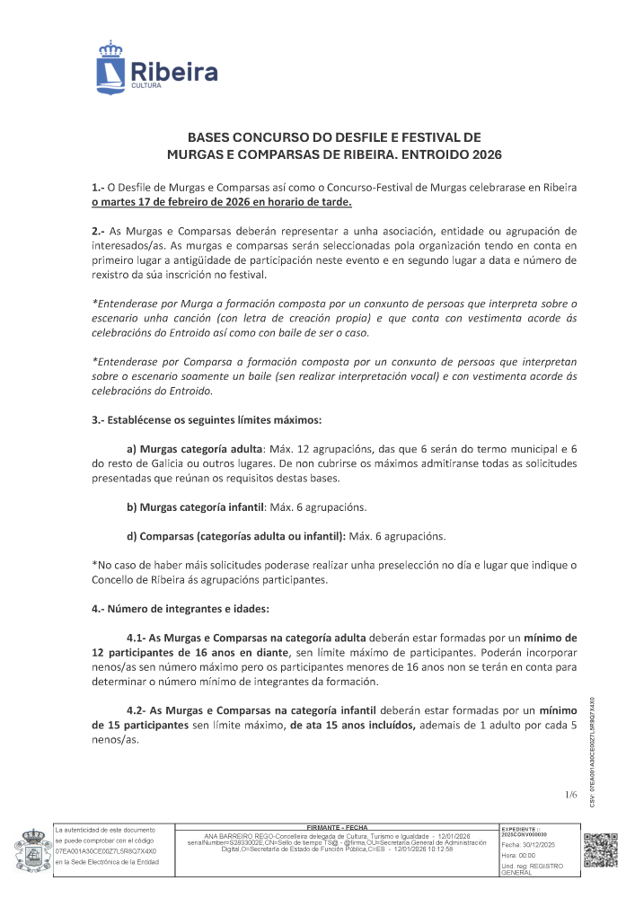 Bases do festival de murgas e comparsas do Entroido 2026 Whatsapp: Bases do festival de murgas e comparsas do Entroido 2026 Data 21 xaneiro 2026 Toda a información do festival de murgas e comparsas do Entroido de Ribeira neste 2026. Documentos Bases do festival de murgas e comparsas do Entroido 2026 (pdf 415,7 kB)