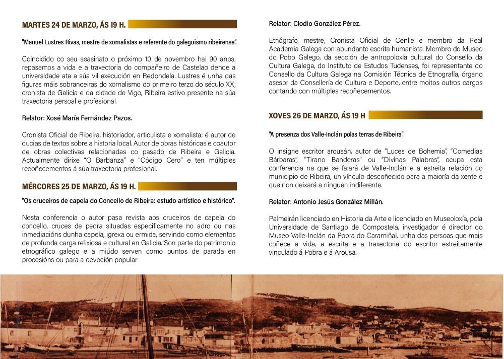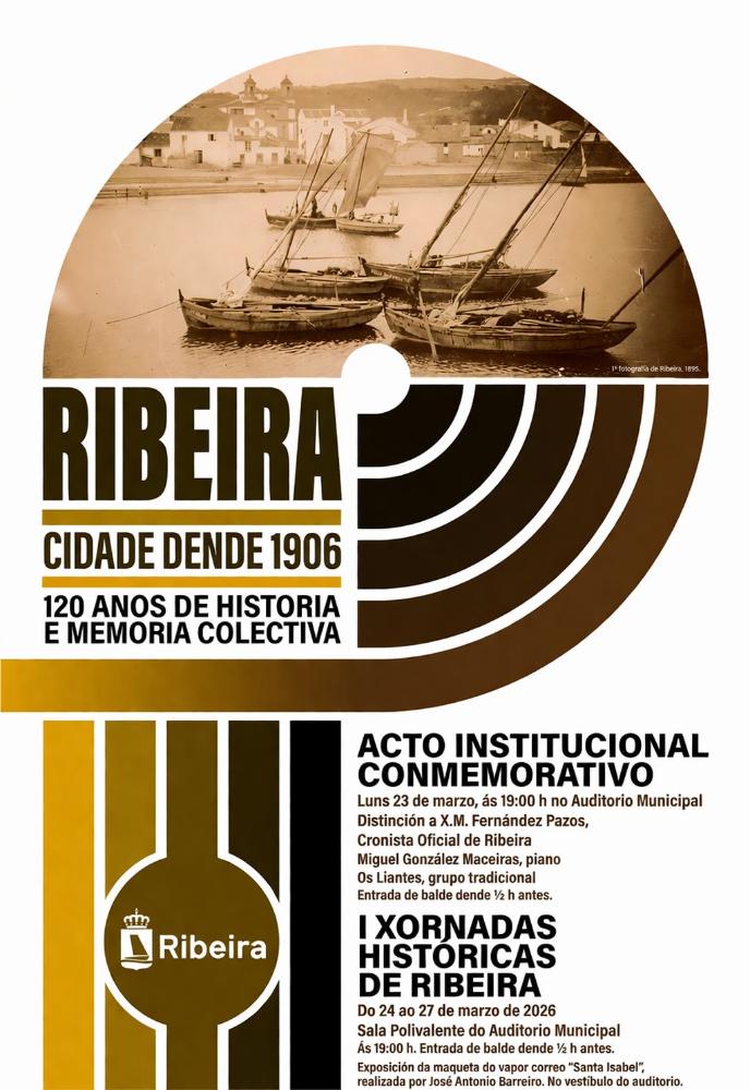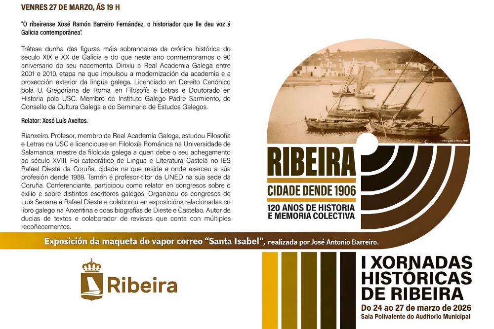Ao abeiro da programación polo 120 aniversario da concesión do título de cidade a Ribeira, o Concello organiza a primeira edición das Xornadas Históricas que afonda en sucesos e persoeiros do municipio. A alcaldesa, María Sampedro, participou onte, martes 24, na inauguración coa conferencia da man do cronista oficial Xosé María Fernández Pazos sobre Manuel Lustres Rivas, mestre de xornalistas e referente do galeguismo ribeirense. Tamén se exhibe por primeira vez en Ribeira unha maqueta do vapor-correo Santa Isabel feita por José Antonio Barreiro. Os coloquios continúan ata o venres 27, ás 19.00 horas, na sala polivalente do novo Auditorio municipal.