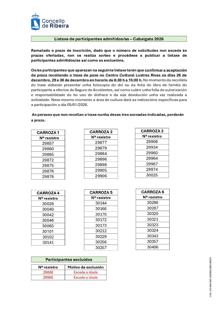 Listaxe de participantes admitidos/as na cabalgata dos Reis Magos no 2026