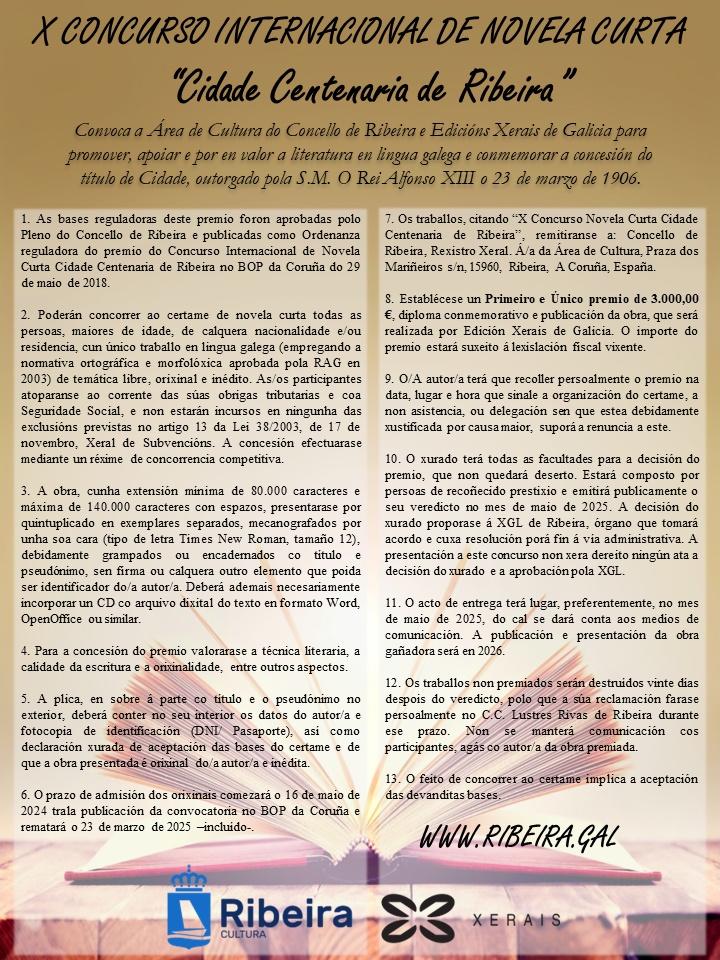 Convoca el área de Cultura del Ayuntamiento de Ribeira y Ediciones Generales de Galicia para promover, apoyar y por en valor a literatura en lengua gallega y conmemorar la concesión del título de Ciudad, otorgado por la S.M. El Rei Alfonso XIII el 23 de marzo de 1906.