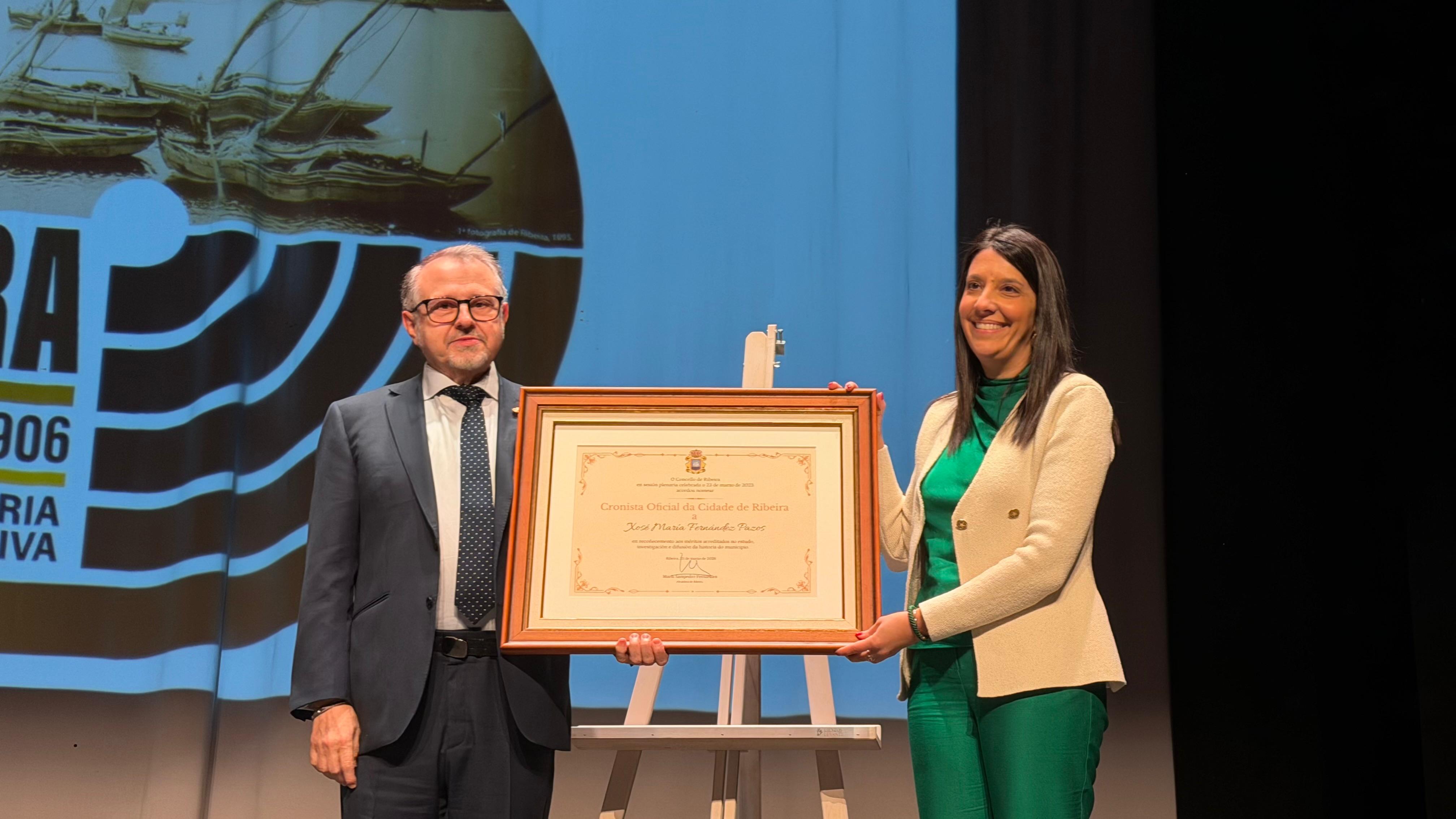 A alcaldesa de Ribeira, María Sampedro, presidiu onte, luns 23, o acto central con motivo do 120 aniversario do título de cidade outorgado en 1906 por parte do Rei don Alfonso XIII. Primeiramente, procedeuse no novo Auditorio municipal coa entrega da distinción ao Cronista Oficial, Xosé María Fernández Pazos, despois do seu nomeamento por acordo unánime da Corporación municipal no Pleno de marzo de 2023; un posto que estaba deserto dende o falecemento de Carlos García Bayón no 2003.