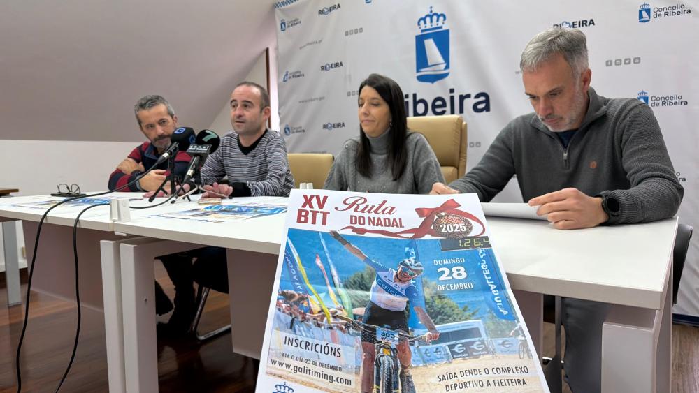 A alcaldesa de Ribeira, María Sampedro, xunto co concelleiro de Deportes, Álex Vidal, participaron no xoves 18 na presentación da XV Ruta do Nadal BTT que organiza a Concellería de Deportes coa colaboración da Asociación de Veciños de Carreira, Arousa NeO, Os Saltamontes, Sportbike e Dalle Pedal. Trátase dunha cita deportiva xa consolidada no calendario deportivo local que agarda reunir a 300 participantes no domingo, 28 de decembro, a partir das 09.00 horas, con saída e chegada establecida no Complexo Deportivo da Fieiteira. Poderase elixir entre dous percorridos: o de 30 ou o de 40 quilómetros, con diferentes niveis de dificultade: arredor de 800 metros positivos na de 30 km e algo máis de 1.000 m na de 40 km.