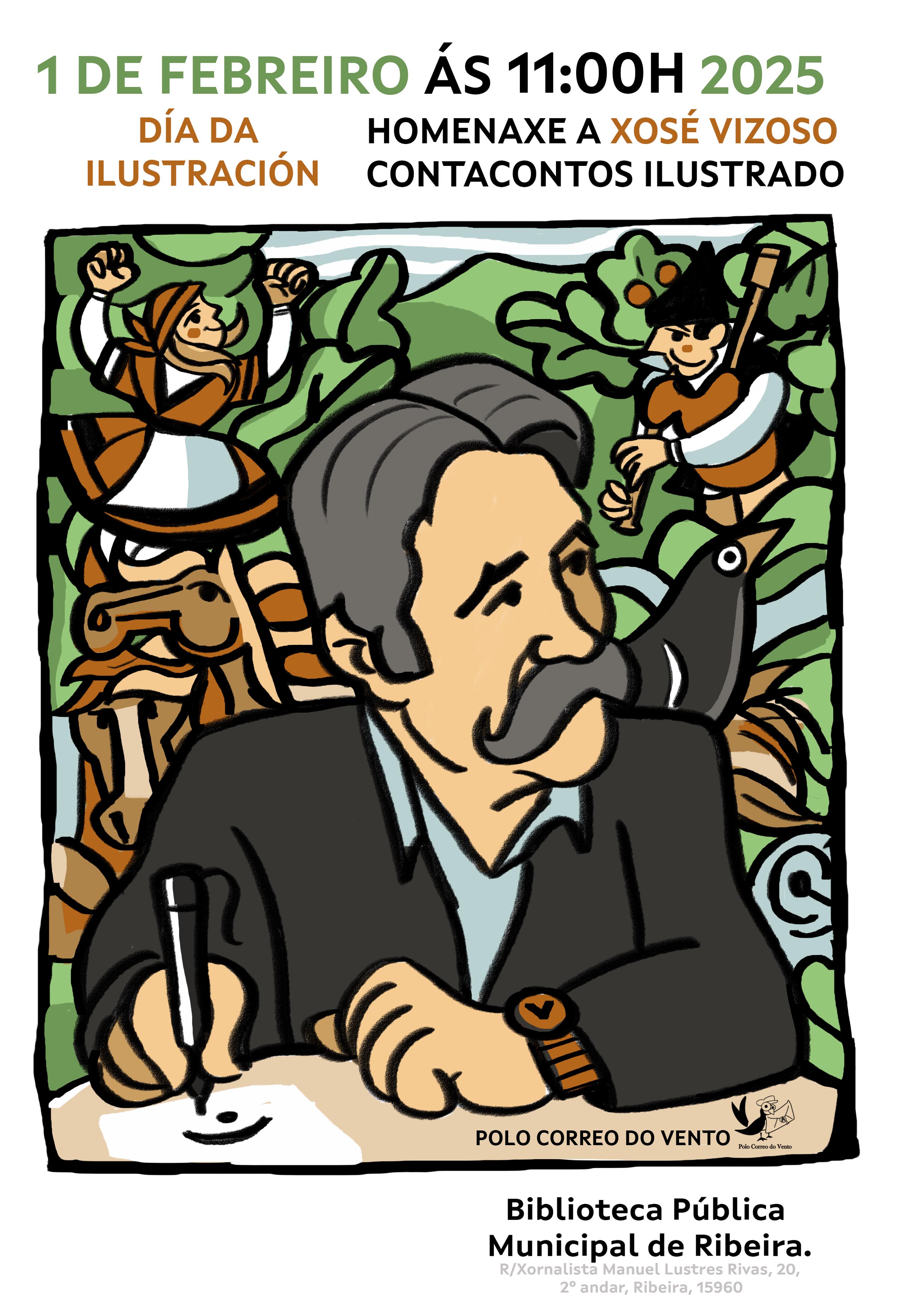 El Día de la Ilustración se celebra cada año cuadrando con la fecha del nacimiento de Castelao. Además de recordar y reivindicar el papel de los profesionales de la ilustración en la industria cultural, cada año se homenajea un ilustrador gallego. Esta edición de 2025 ve dedicada a Xosé Vizoso, que es el primero autor homenajeado en vida. Vizoso nos es bien conocido, ya veremos como sabemos de él muchas cosas, y conocemos muchas obras, pero además con Por el Correo del Viento aprenderemos a hacerle un retrato... Ben, una caricatura xeitosa! Y también cantaremos canciones para que sea la gran fiesta del dibujo.