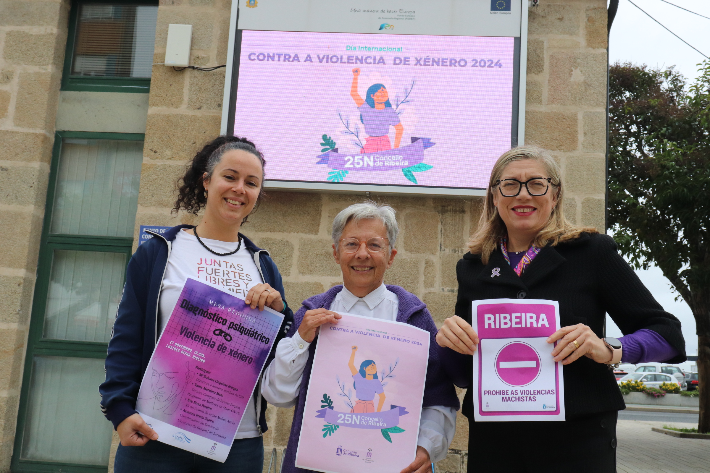 Ribeira como cada año se va a adherir a las diferentes campañas institucionales, y para comenzar que del propio ayuntamiento, que va a ser sencilla y muy ilustrativa: “Ribeira prohíbe las violencias machistas” donde se pide la colaboración de todos los establecimientos de Ribeira, tanto comercio como hostelería donde se le facilitará unos vinilos con unas señales de prohibición donde se muestra el compromiso de Ribeira cas violencias machistas; se repartirán este fin de semana para poner en los escaparates. También  el ayuntamiento se adhiere a la campaña de la Xunta “Camino al respeto” (andadura), a la campaña de la Diputación, “De cara a la violencia de género” y la campaña de la Fegamp, “Que la vergüenza cambie de bando”. Y siguiendo, habrá una colaboración con la Asociación Mujeres en Acción para la colocación de una placa en memoria de Andrea Yturry Alave y de todas las mujeres, niñas y niños, víctimas de las violencias machistas.