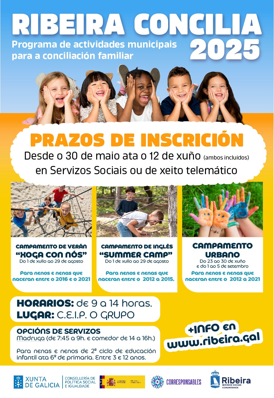El programa de conciliación se celebra desde hace años como una programación estable adquiriendo grande demanda y satisfacción ciudadana. En esta ocasión, es de interés del área de Servicios Sociales impulsar los campamentos de conciliación durante las vacaciones del Verano 2025 y navideño del 2025/2026, coincidiendo con las fechas de las vacaciones escolares, de lunes a viernes –excepto festivos- de 09 a 14 h con posibilidad de servicios de conciliación para las familias que lo precisen ( servicio madrugadores y servicio de comedor ) . Este programa esta destinado la familias con niños y niñas de 3 años (escolarizados) a 12 años con el objetivo de que los más nuevos pasen unas vacaciones de ocio y divertimento, en un espacio seguro con profesionales al suyo cuidad, aprendiendo contenidos de todo tipo y en ámbitos relacionados con la cultura, igualdad, el medio ambiente o las nuevas tecnologías.