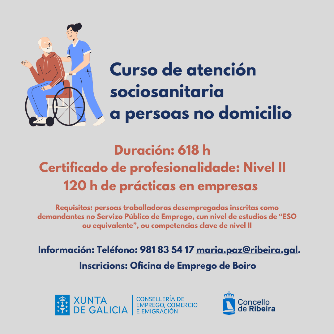 INFORMACIÓN: las personas interesadas en participar como alumnado en este curso pueden informarse en la Oficina de Desarrollo Local (Ayuntamiento de Ribeira – Auditorio viejo). Plaza de los Marineros, s/n. Tel.: 981835417. Dirección electrónica: maria.paz@ribeira.gal.