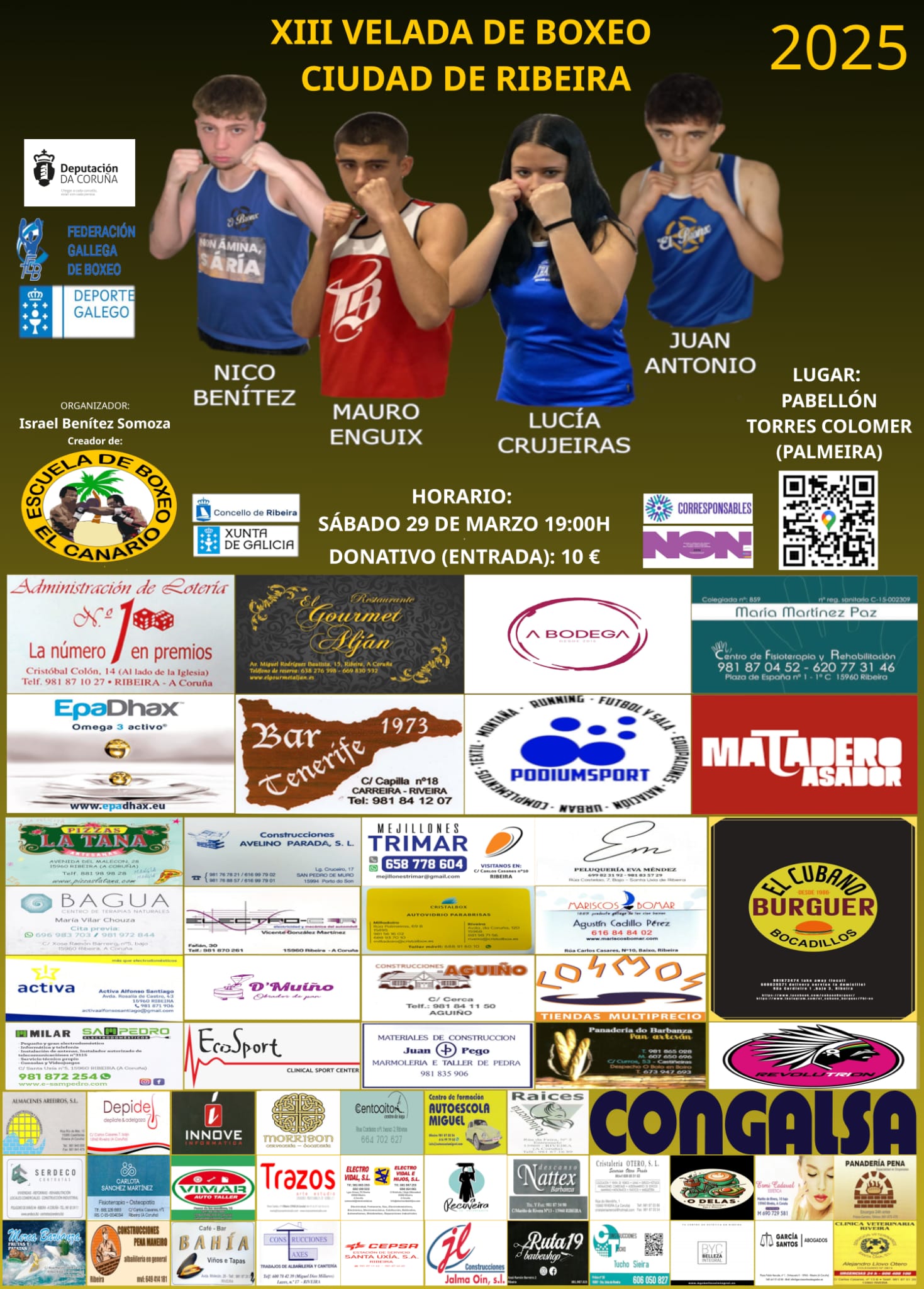 O prezo das entradas será de 10 euros e estarán á venta na sala da Escola de Boxeo el Canario na rúa Carlos Casares en Ribeira e no bar Tenerife en Carreira, tamén se poderán adquirir o mesmo día do evento.