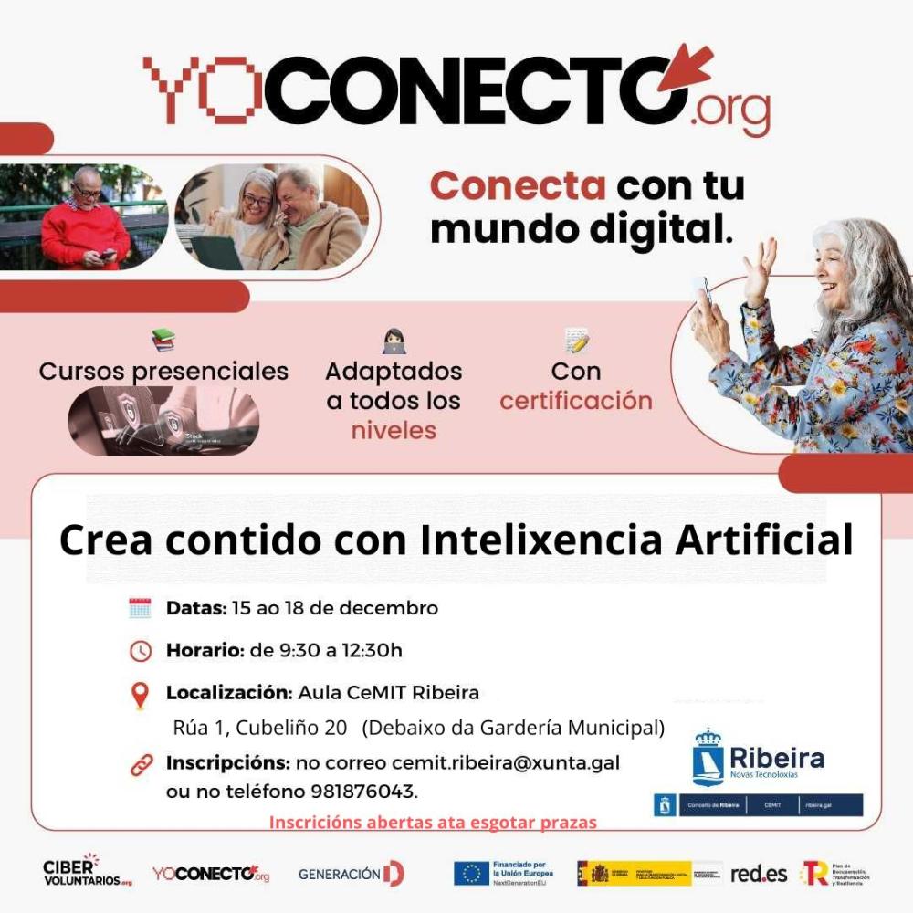 Esta mesma entidade será tamén a encargada de ensinar Crea contido con Intelixencia Artificial, do 15 ao 18 de decembro, de 09.30 a 12.30 horas. O obxectivo é descubrir as posibilidades da IA para a produción de contido a través de ferramentas para xerar imaxes, vídeos e textos de forma eficiente e creativa.