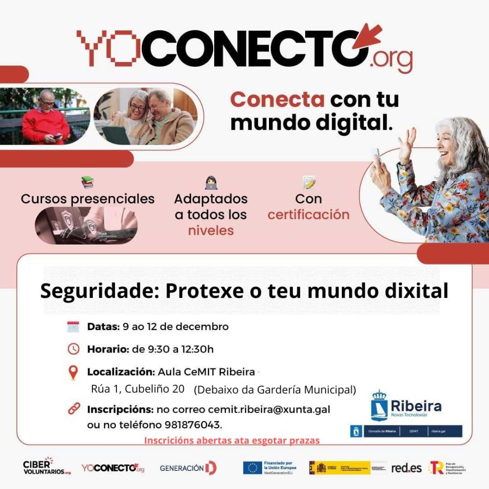 O curso Seguridade: protexe o teu mundo dixital marcará o inicio desta axenda. A fundación Cibervoluntarios impartirá esta acción do 9 ao 12 de decembro, en horario de 09.30 a 12.30 horas, coa finalidade de ensinar aos asistentes estratexias para protexer os datos persoais e a información en liña, garantindo unha maior seguridade na Internet.