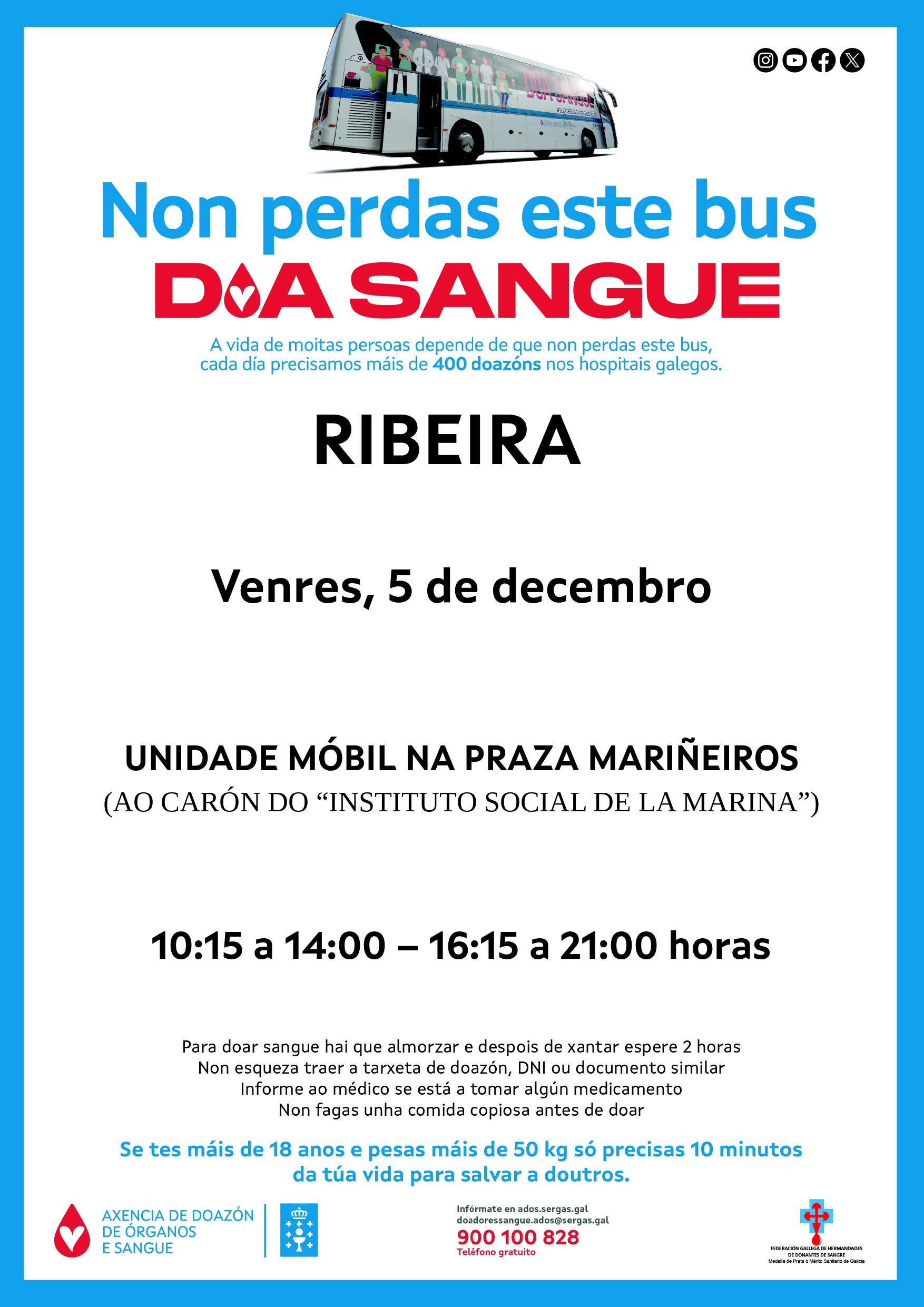 A unidade móbil para a doazón de sangue estará no venres, 5 de decembro, na praza dos Mariñeiros de Ribeira (a carón do Instituto Social de la Marina). Será en horario de 10.15 a 14.00 e de 16.15 a 21.00 horas.