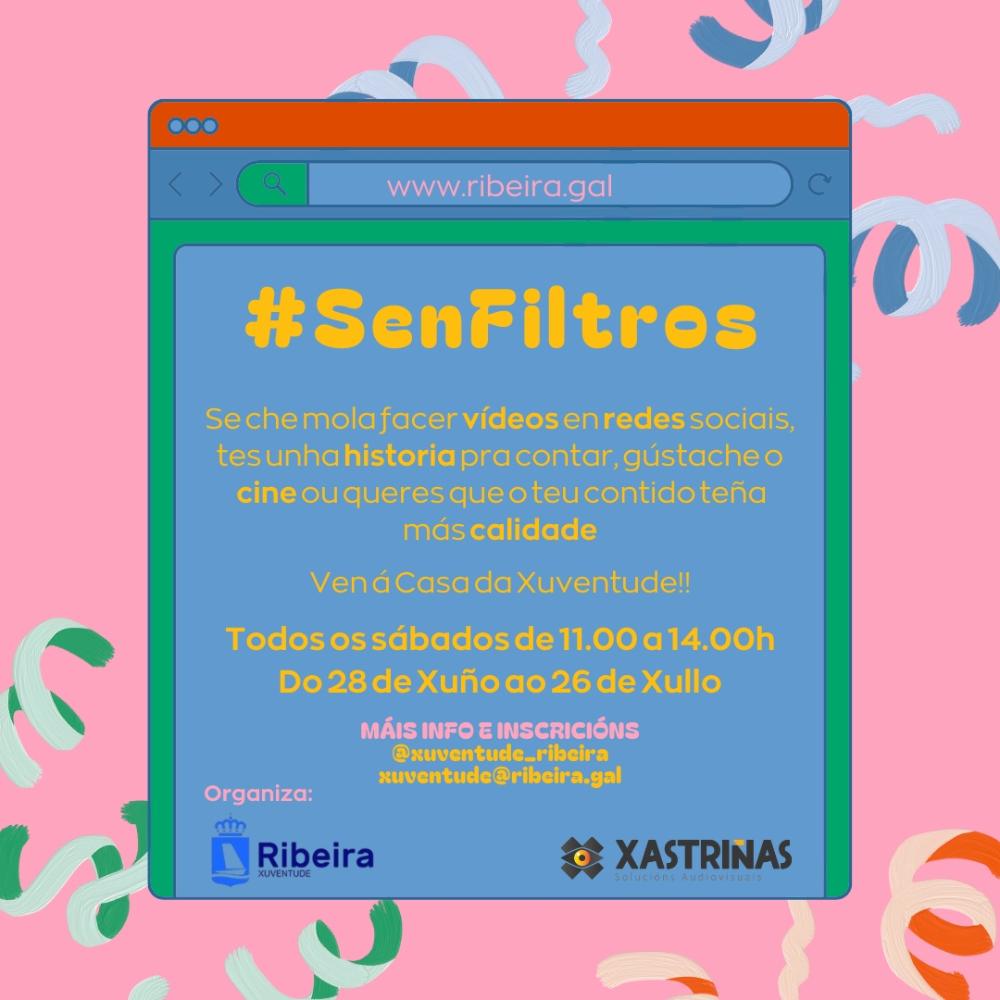 A concelleira recordou que na semana pasada se presentaron as actividades deportivas para o público xuvenil e as escolas náuticas cuxas bases xa están publicadas na web e as inscricións xa están abertas; “e hoxe, presentamos esta nova actividade chamada #SenFiltros que serán seis xornadas de obradoiros audiovisuais que sen van a desenvolver tódolos sábados pola mañá na Casa da Xuventude a partir do vindeiro sábado 28 de xuño; as inscricións poden facerse a través das redes sociais de Xuventude (Instagram e Facebook) e tamén no correo xuventude@ribeira.gal”, informou a concelleira que finalizou animando á mocidade a apuntarse aos obradoiros audiovisuais.
