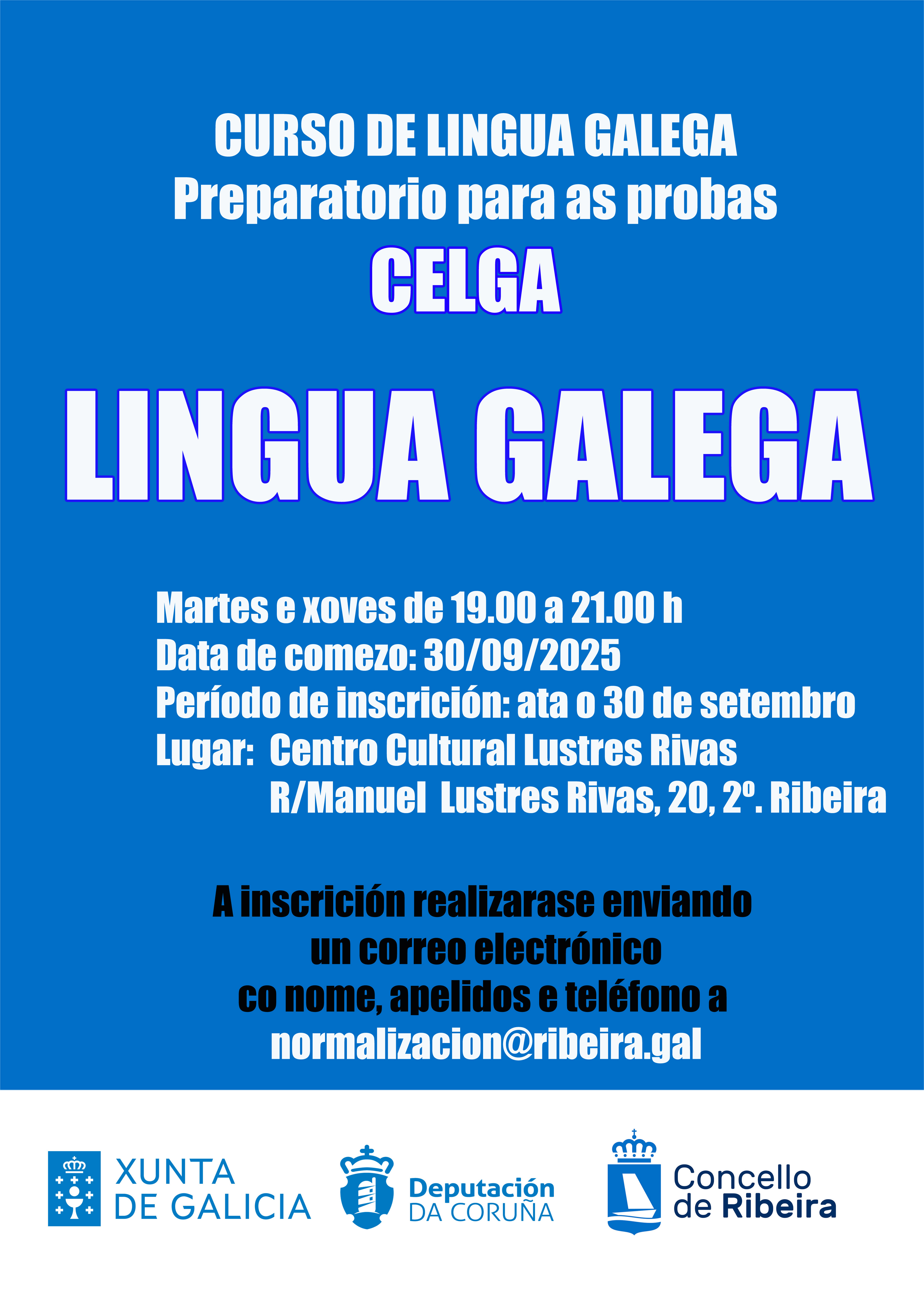 O Servizo de Normalización Lingüística do Concello de Ribeira pon en marcha un novo curso de lingua galega dirixido ás persoas, maiores de 16 anos, que se vaian presentar ás probas CELGA da Xunta de Galicia. Este curso é gratuíto e en horario de tarde (martes e xoves de 19 a 21 h). A inscrición estará aberta aberta ata o día 30 de setembro, data na que dará comezo. Todas as persoas que teñan interese en asistir poderán inscribirse enviando un correo electrónico a normalizacion@ribeira.gal
