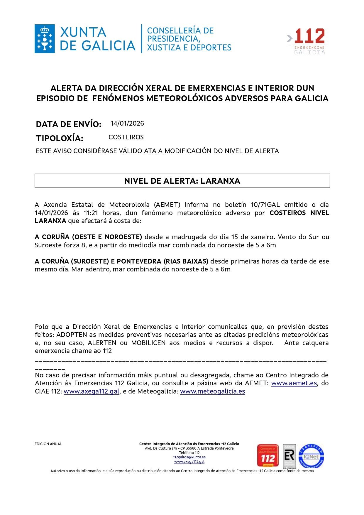 Aviso por un episodio dun fenómeno meteorolóxico adverso por costeiros Whatsapp: Aviso por un episodio dun fenómeno meteorolóxico adverso por costeiros Data 14 xaneiro 2026 O Centro Integrado de Atención ás Emerxencias 112 Galicia informa sobre un fenómeno meteorolóxico adverso do nivel laranxa por costeiros.